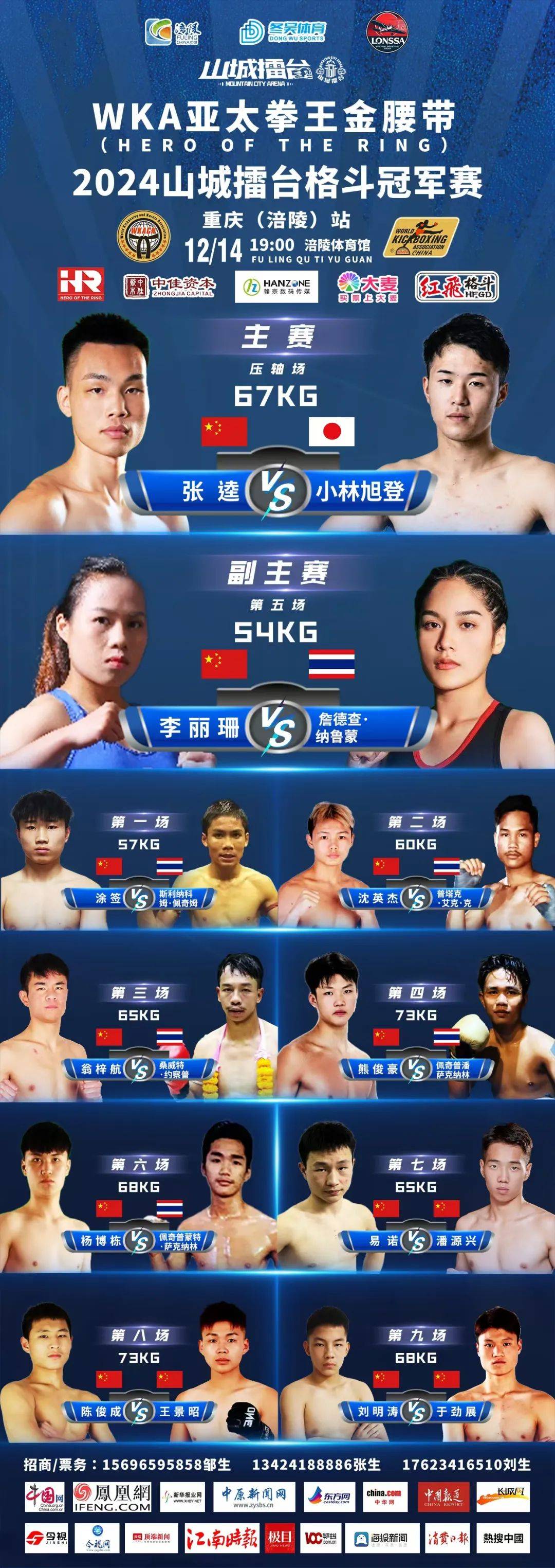 2024年12月14日山城擂台格斗冠军赛暨 WKA 亚太拳王金腰带争霸赛在中国涪陵体育馆震撼开赛。本次赛事邀请了中国、泰国、日本三个国家的精英选手参赛,这场赛事汇集了国内外知名运动员齐聚涪陵区,并邀请了重量级嘉宾评委“国家级运动健将,原中国散打队队长”付高峰、世界警察格斗冠军:邢金喜。