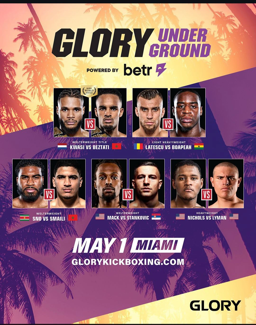 Glory Underground: Kwasi vs. Beztati 2 is a kickboxing event held by Glory Kickboxing on May 1, 2025, at the Betr Warehouse in Miami, Florida, United States.文章源自武享吧-https://hula8.net/glory/75332.html