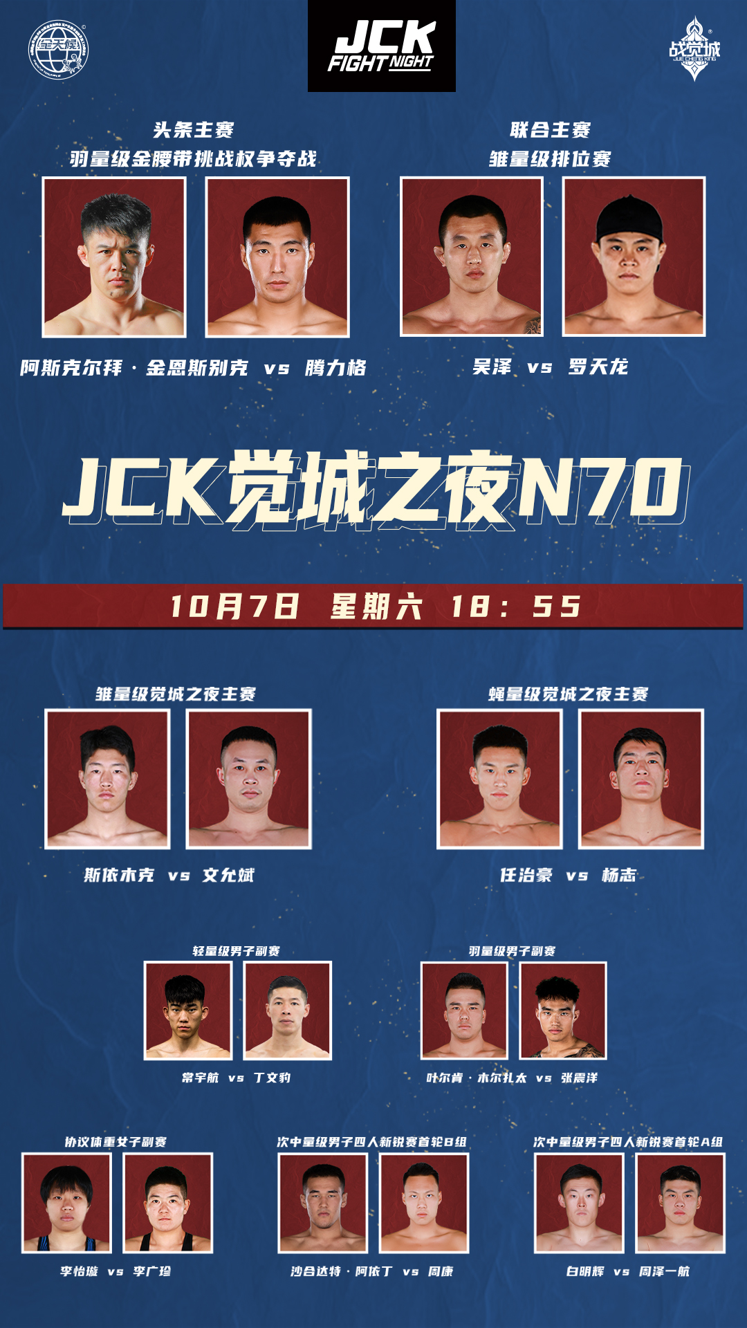 2023年10月7日JCK觉城之夜第70期,曾经的“赏金之王”阿斯克尔拜·金恩斯别克重返JCK战觉城八角笼,二番战再战“赵家军”铁血悍将腾力格,这是JCK战觉城史上首场金腰带挑战权之战,二人获胜方将挑战羽量级首条金腰带获得者王纪征,让我们共同期待!下面为直播信号,赛后视频本页更新。
