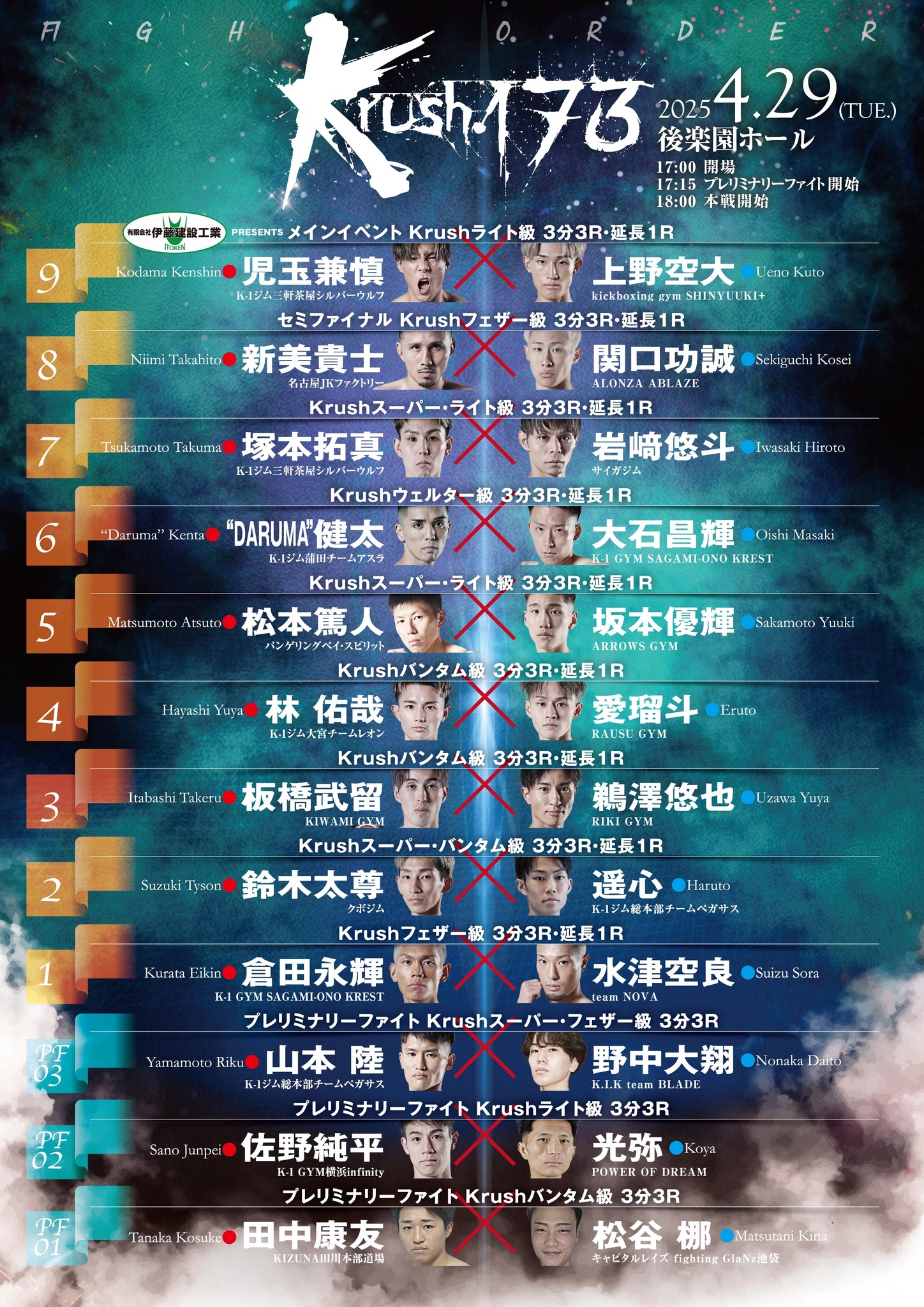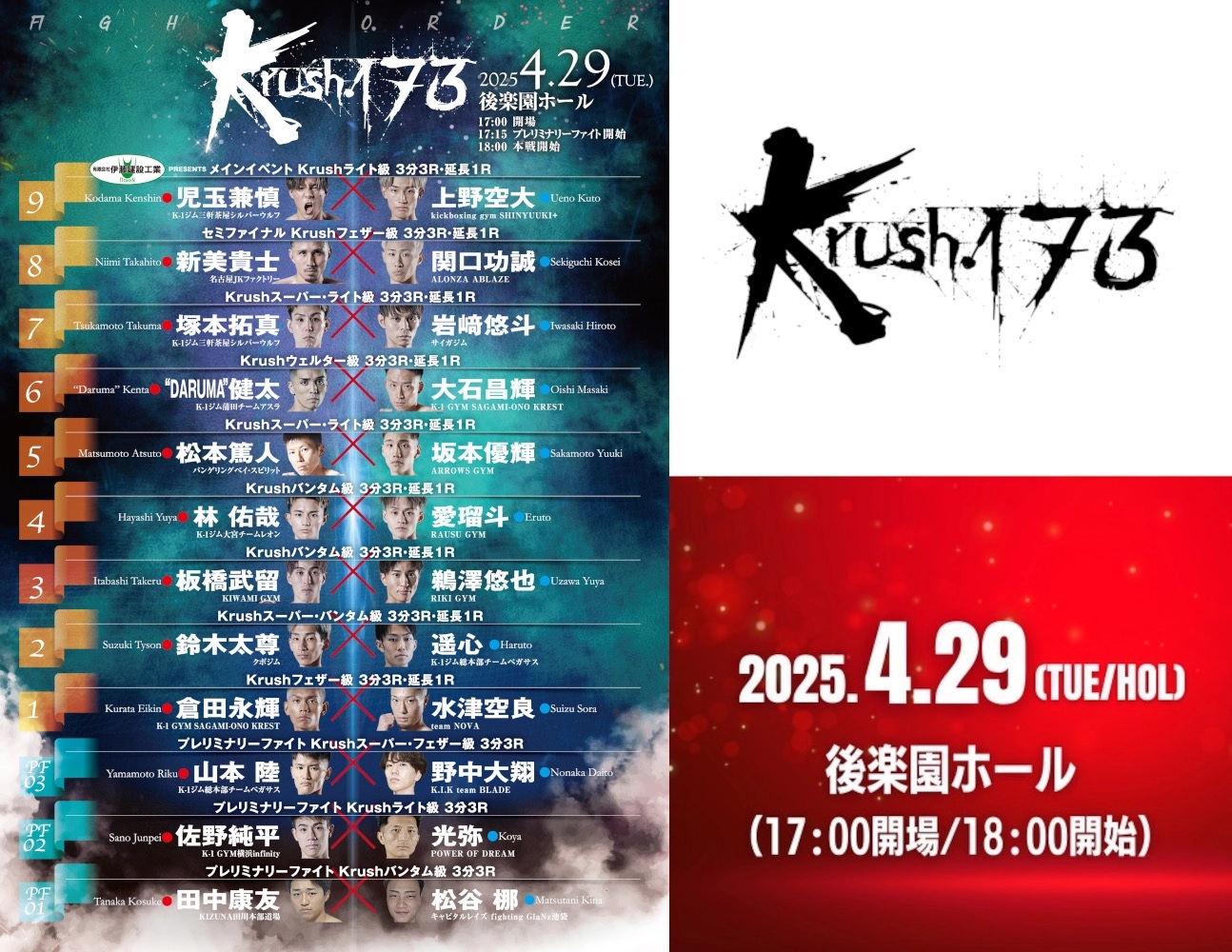「Krush.173」4.29(火・祝)後楽園ホール大会、全12カードの試合順が決定しました。