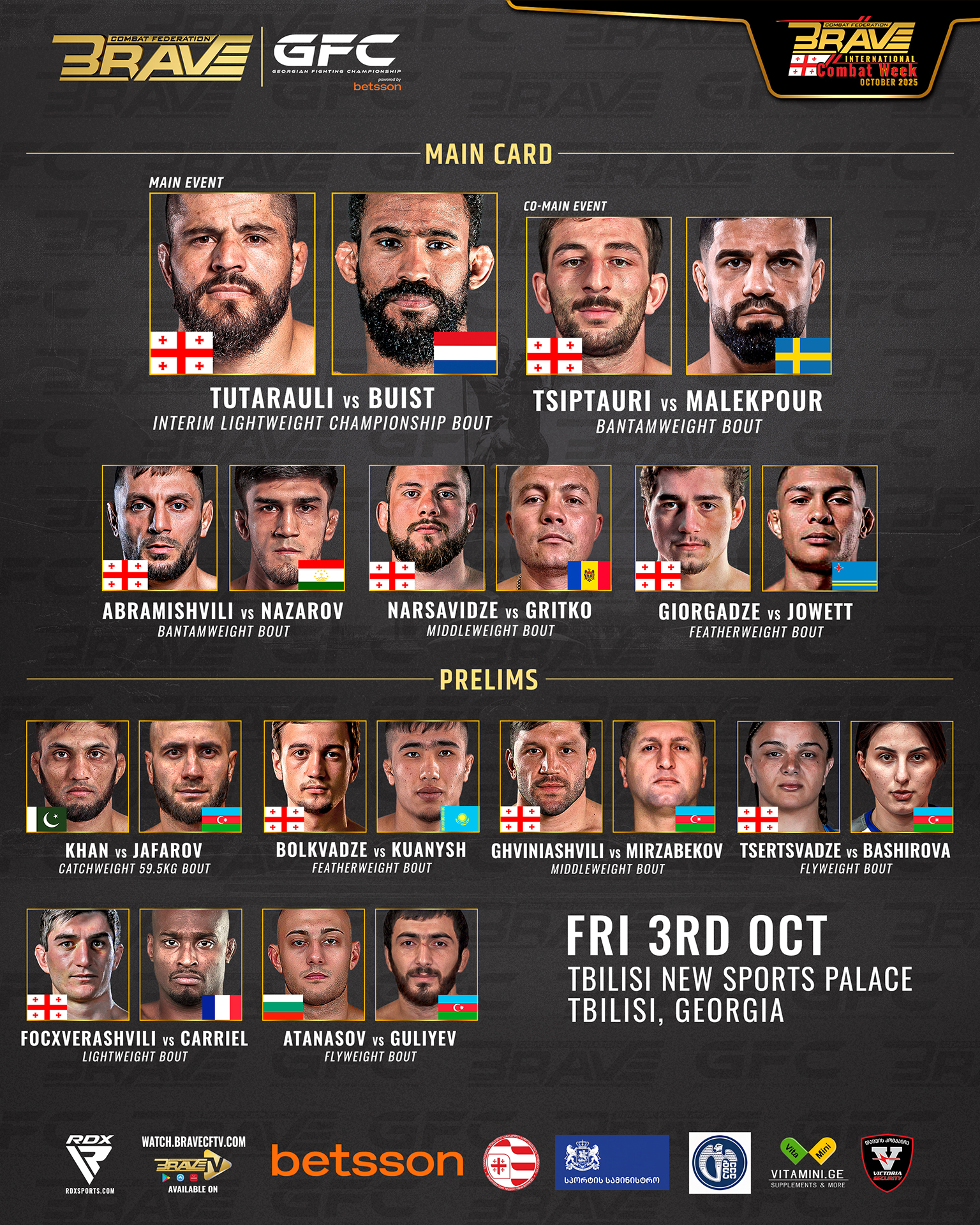 BRAVE CF Georgia vs. The World: Tutarauli vs. Buist will be a mixed martial arts event held by Brave Combat Federation on October 3, 2025 at the Tbilisi New Sports Palace in Tbilisi, Georgia.文章源自武享吧-https://hula8.net/mma/76104.html