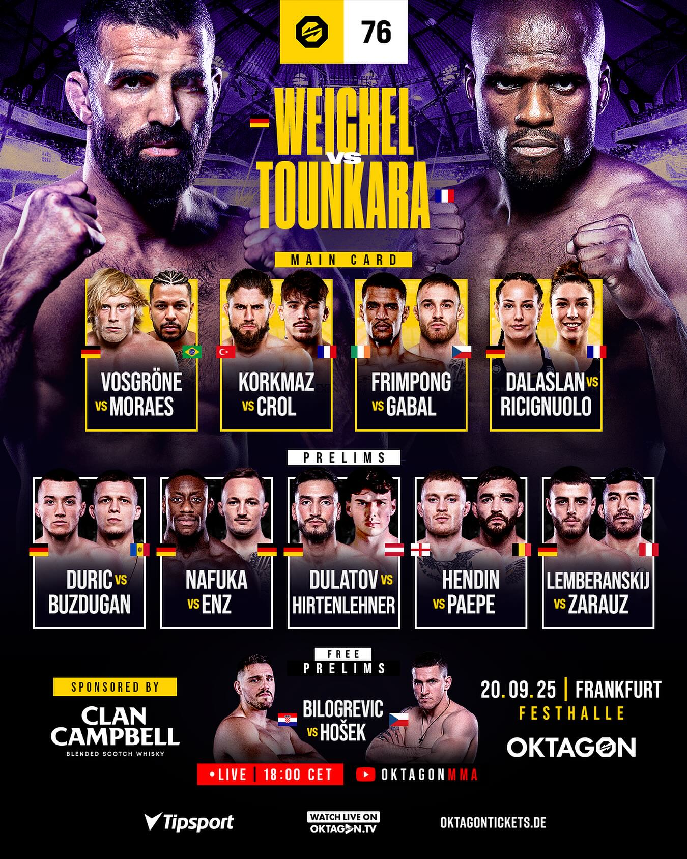 Frankfurt legend Weichel (57 fights, ex-Bellator champ) fights at home again! Opponent Tounkara is a KO artist with 3 wins in last 4 and wants to silence the German crowd.