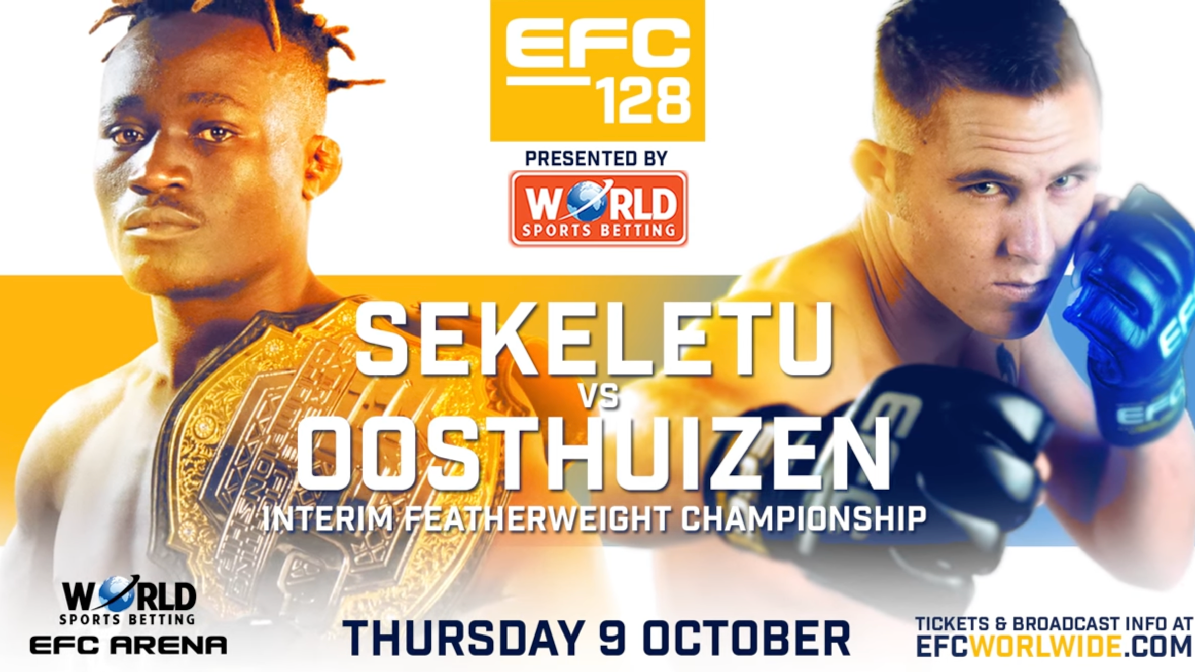 EFC 128: Sekeletu vs. Oosthuizen is an upcoming mixed martial arts event by Extreme Fighting Championship scheduled for October 9, 2025 at the WSB EFC Arena in Sandton, South Africa.文章源自武享吧-https://hula8.net/mma/76196.html