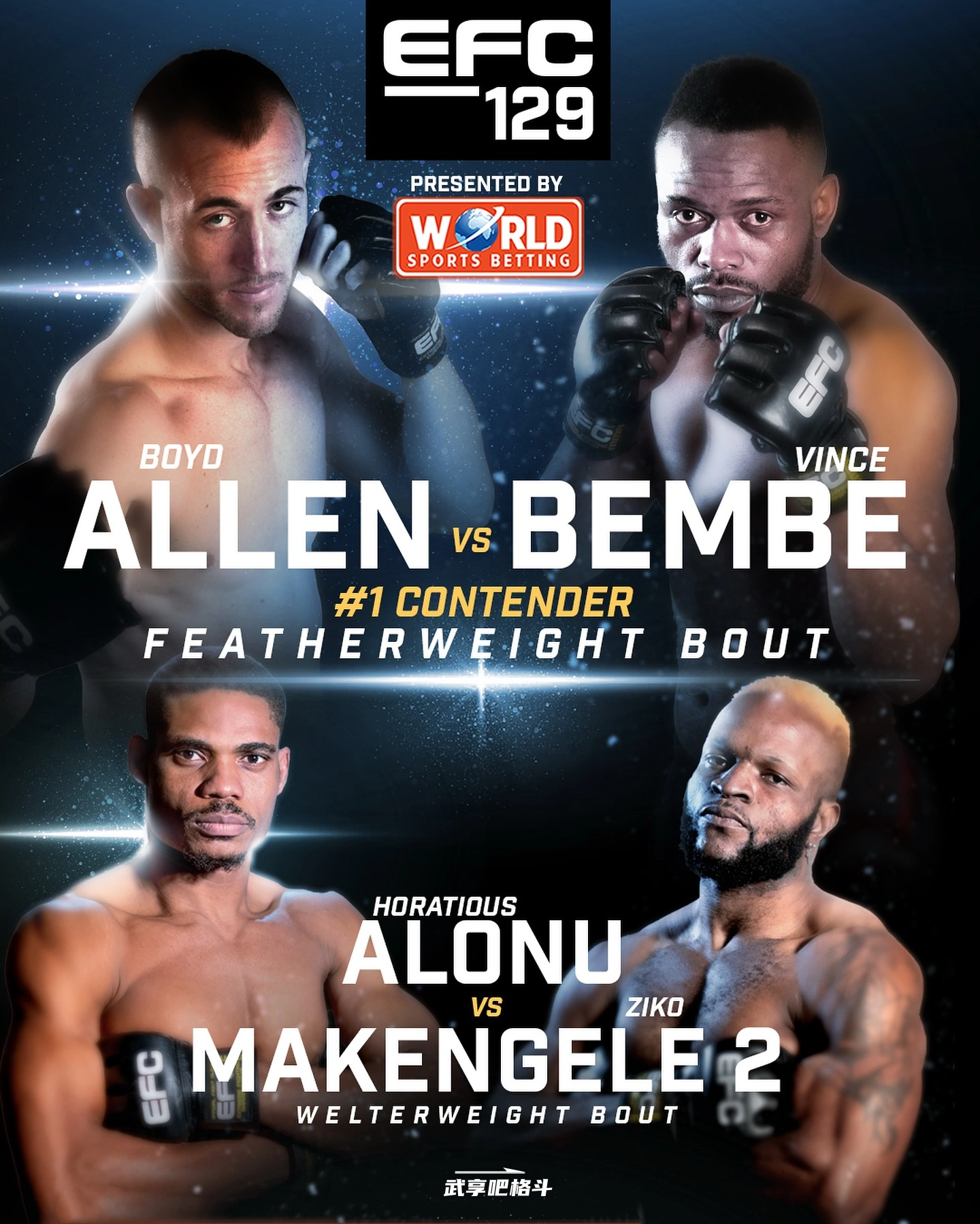 EFC 129: Allen vs. Bembe is an upcoming mixed martial arts event by Extreme Fighting Championship scheduled for November 6, 2025 at the WSB EFC Arena in Sandton, South Africa.文章源自武享吧-https://hula8.net/mma/76292.html
