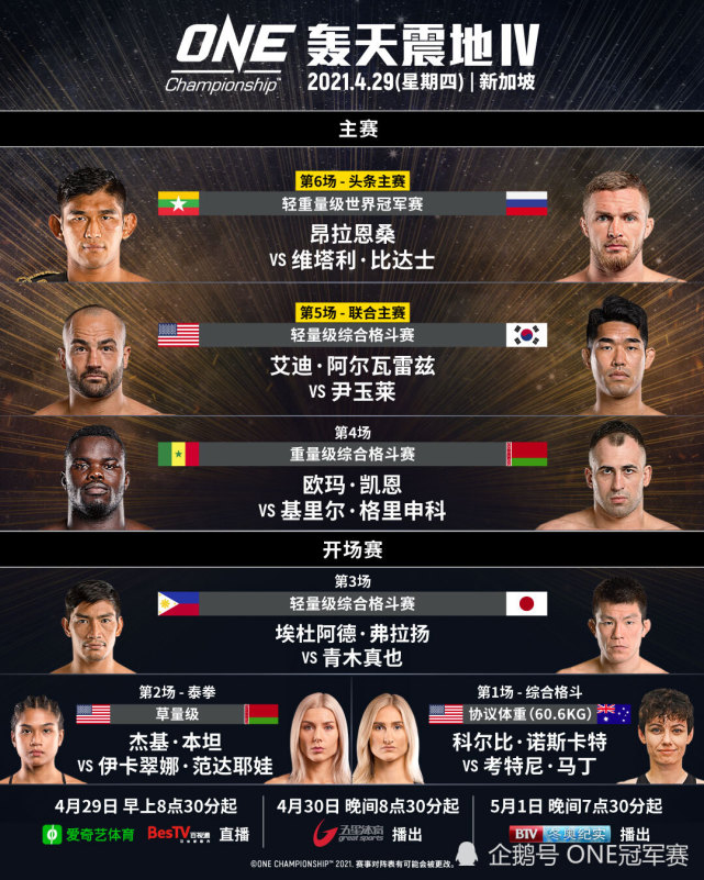 4月22日“ONE:轰天震地III”带来五场激动人心的战斗,其中包括两场炸裂KO。文章源自武享吧-https://hula8.net/one-fc/44226.html