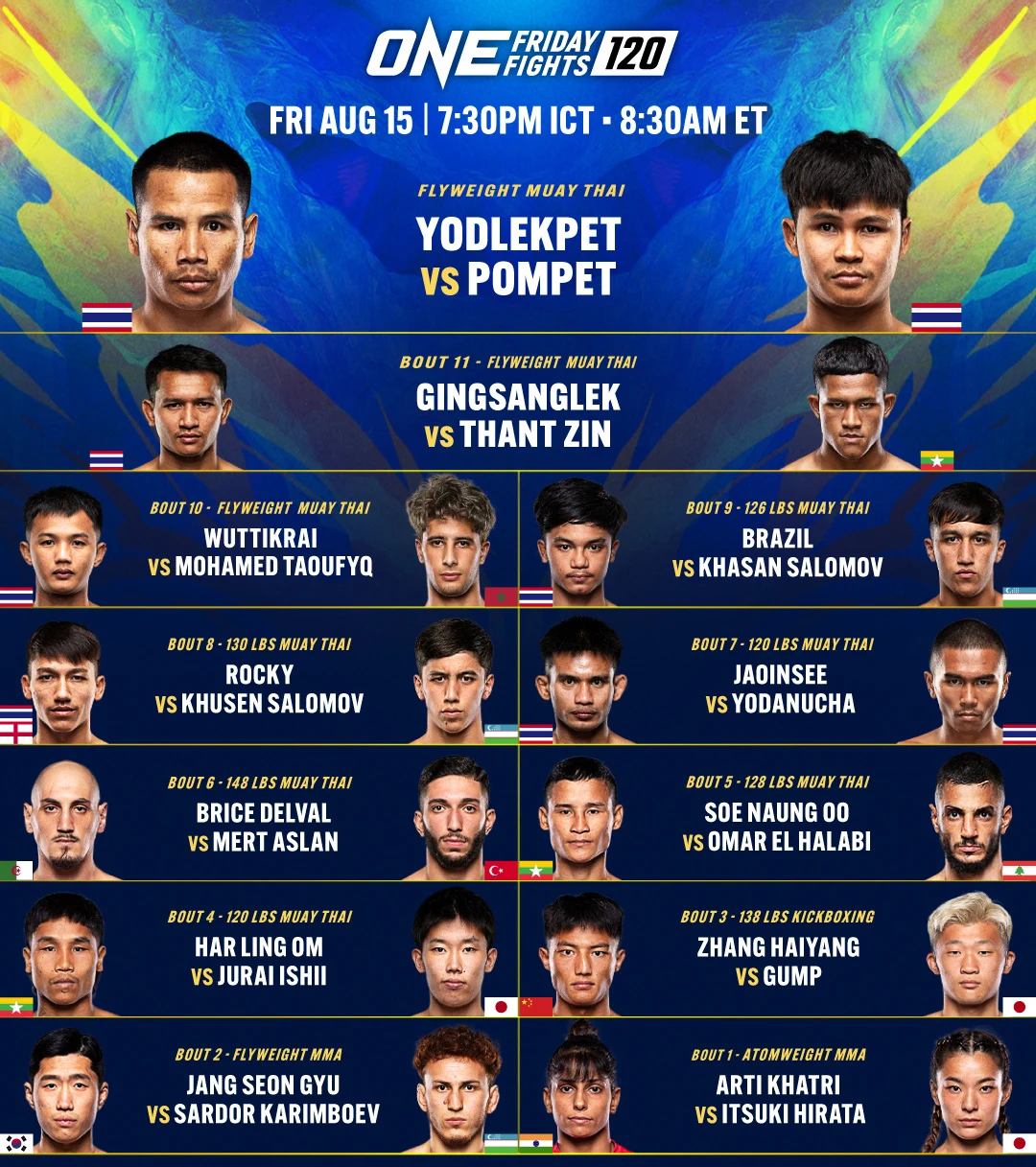 ONE Friday Fights 120: Yodlekpet vs. Pompet (also known as ONE Lumpinee 120 and "The Test of a True Diamond") is an upcoming combat sports event produced by ONE Championship that will take place on August 15, 2025, at Lumpinee Boxing Stadium in Bangkok, Thailand.文章源自武享吧-https://hula8.net/one-fc/one-friday-fights/75944.html