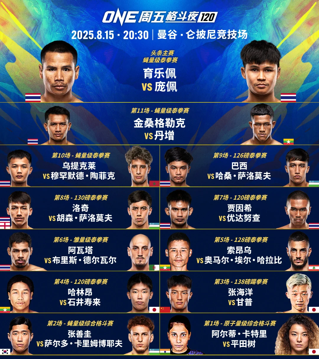 2025年8月15日,“ONE周五格斗夜120”将重返曼谷标志性的仑披尼竞技场。本期赛事汇聚全球24位泰拳、踢拳及综合格斗领域的运动员,他们将为争夺六位数美元的ONE冠军赛正式合同全力拼搏。