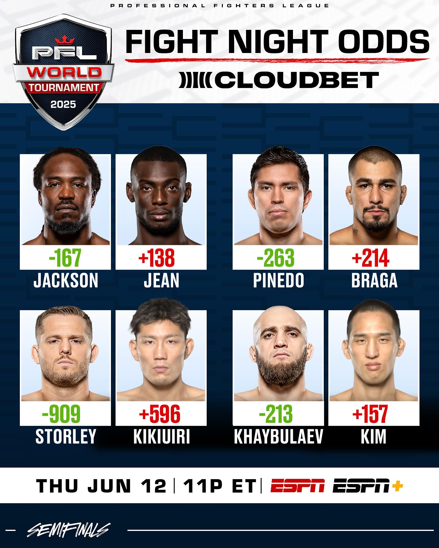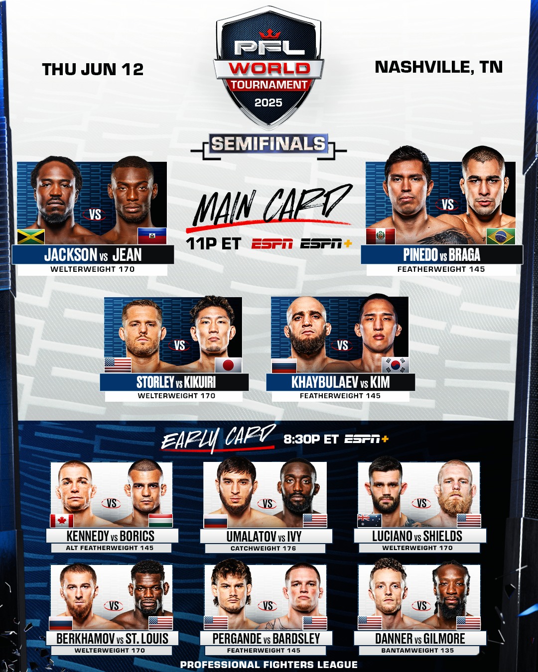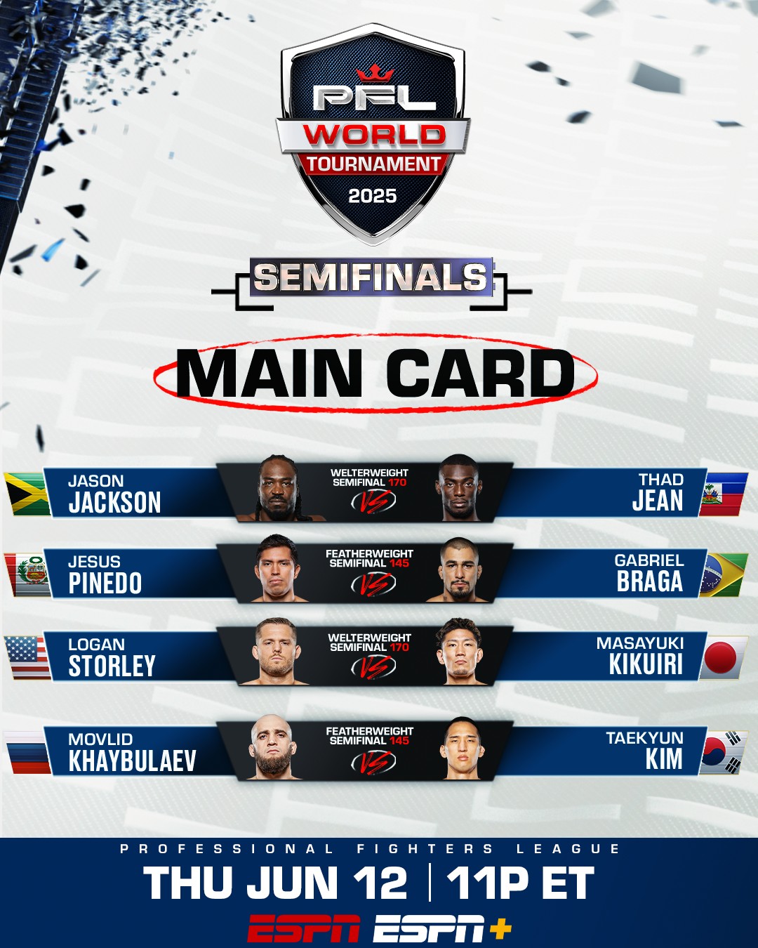 In the main event, former Bellator World Champion and fan-favorite Jason Jackson (19-5) faces undefeated rising star Thad Jean (9-0) in the Welterweight Semifinal. In the co-main event, 2023 PFL Featherweight Champion Jesus Pinedo (24-6) meets Gabriel Braga (16-2) in the rubber match of their highly anticipated trilogy bout that also serves as a 2025 World Tournament Featherweight Semifinal.