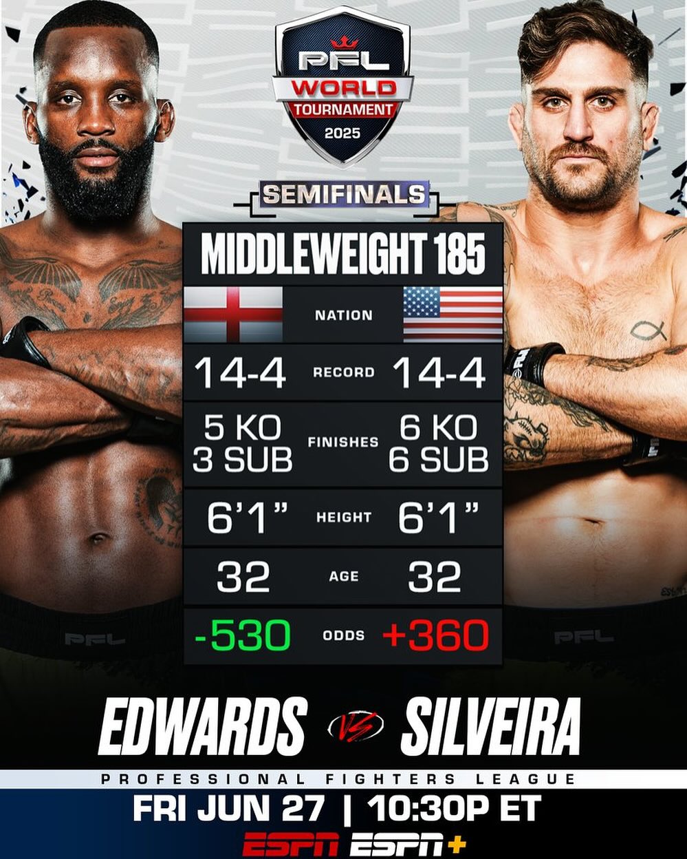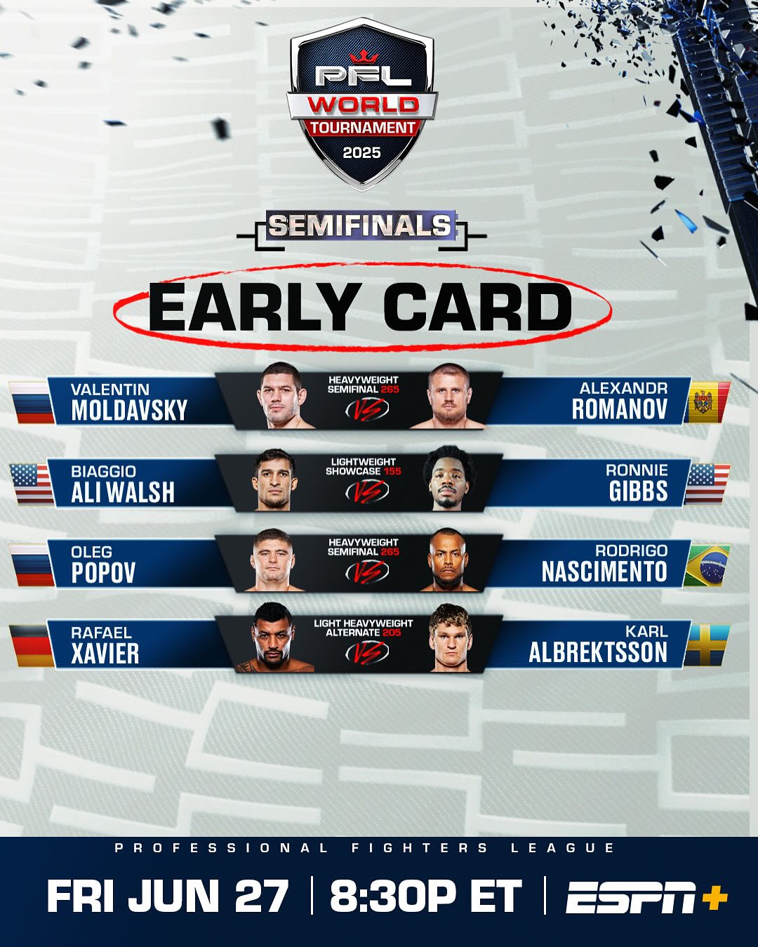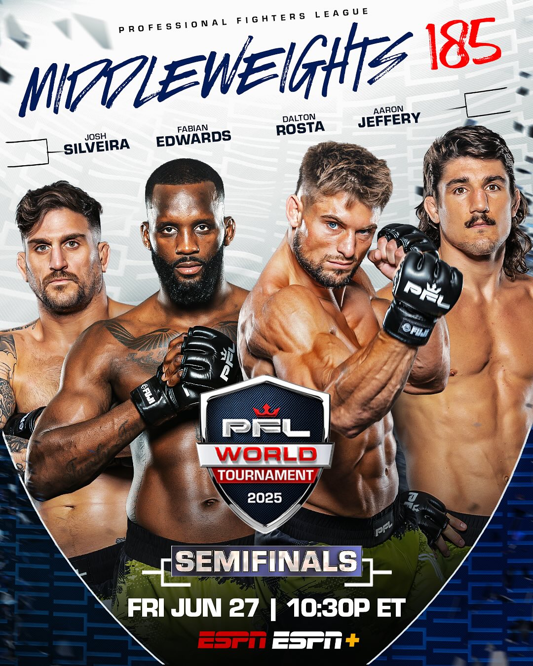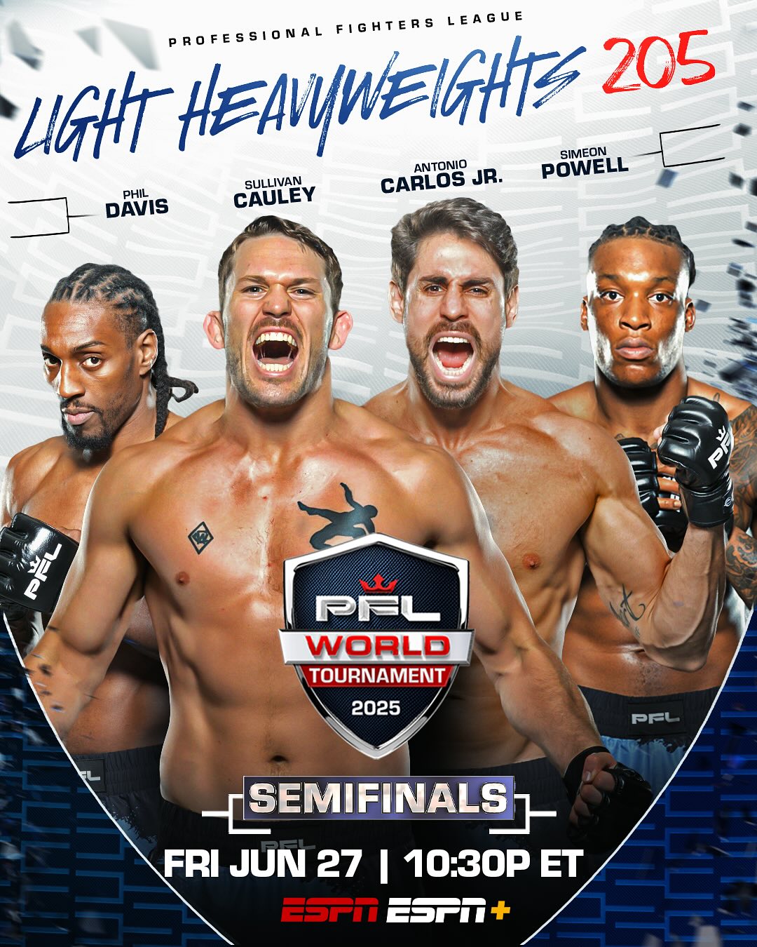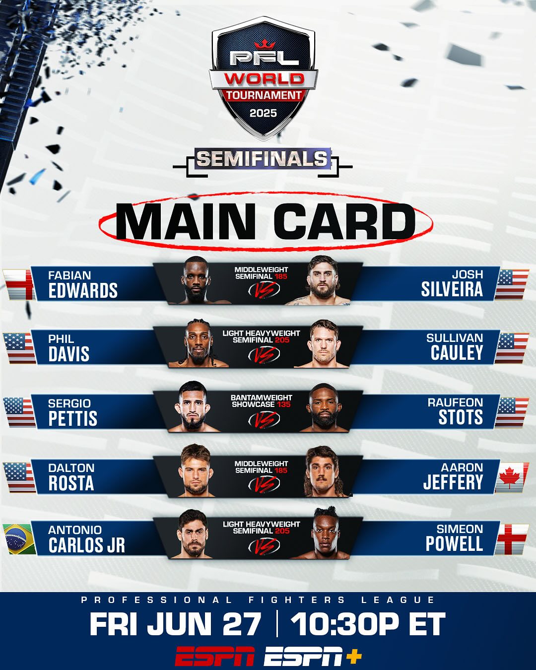 A Middleweight Semifinal between Fabian Edwards (14-4) and Josh Silveira (14-4) will headline the event, with Light Heavyweights Phil Davis (25-7) and Sullivan Cauley (7-1) clashing in the co-main. The first Middleweight Semifinal features a rematch between Aaron Jeffery (16-5) and Dalton Rosta (10-1), while Antonio Carlos Jr. (17-6) faces England’s Simeon Powell (11-1) in the second 205-pound Semifinal. Rounding out the 2025 PFL World Tournament Semifinal action on June 27 are the Heavyweights, as Valentin Moldavsky (14-4) meets Alexander Romanov (19-3), and Oleg Popov (20-2) squares off against Rodrigo Nascimento (12-3).