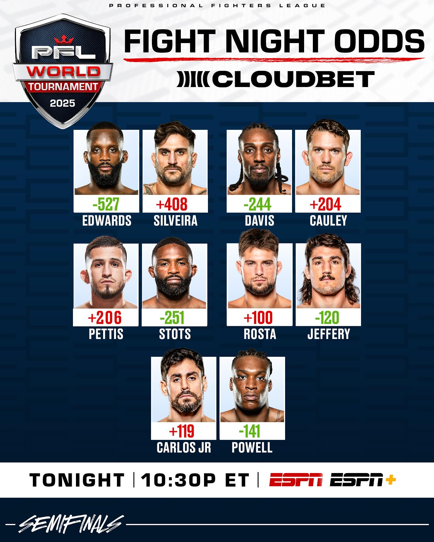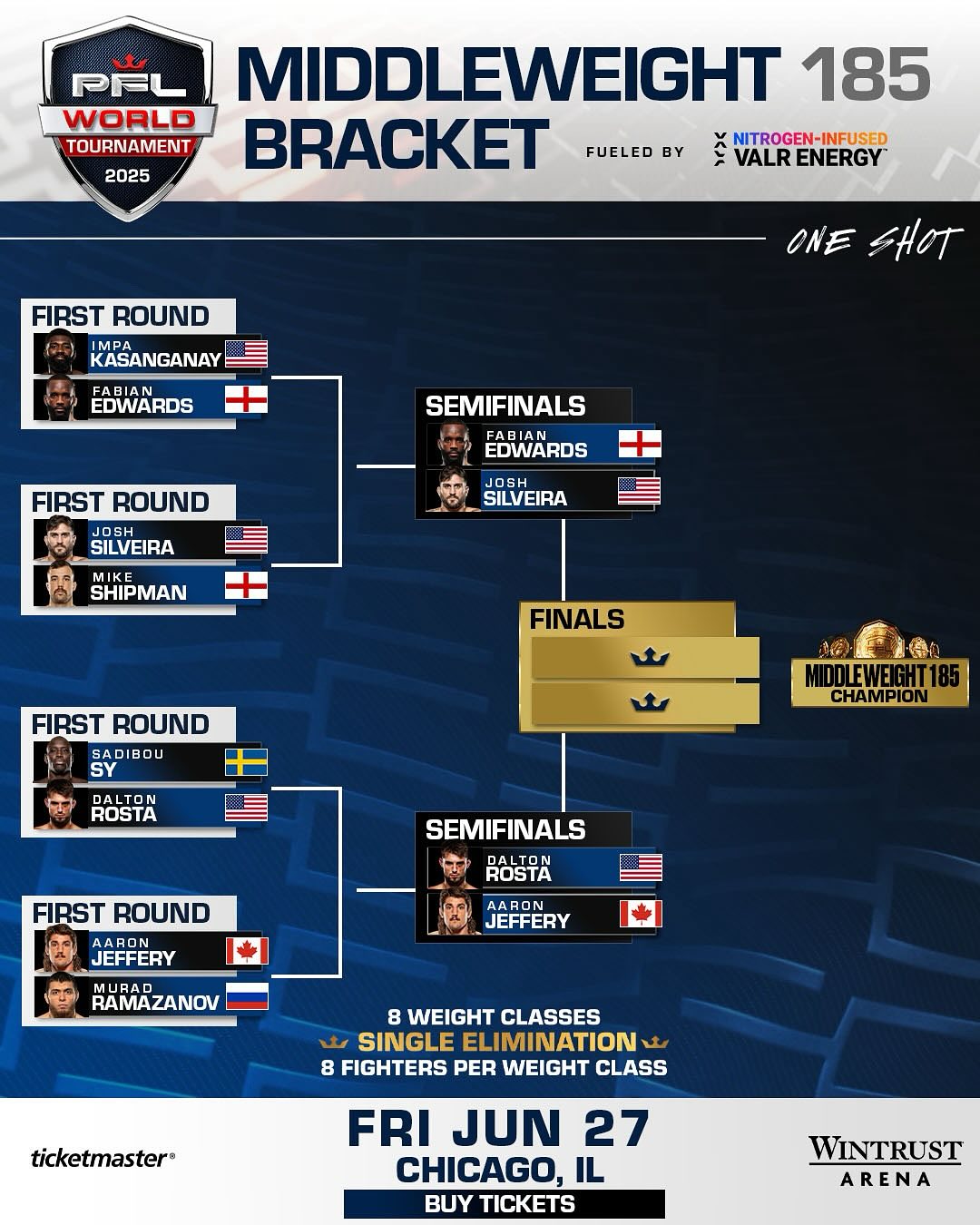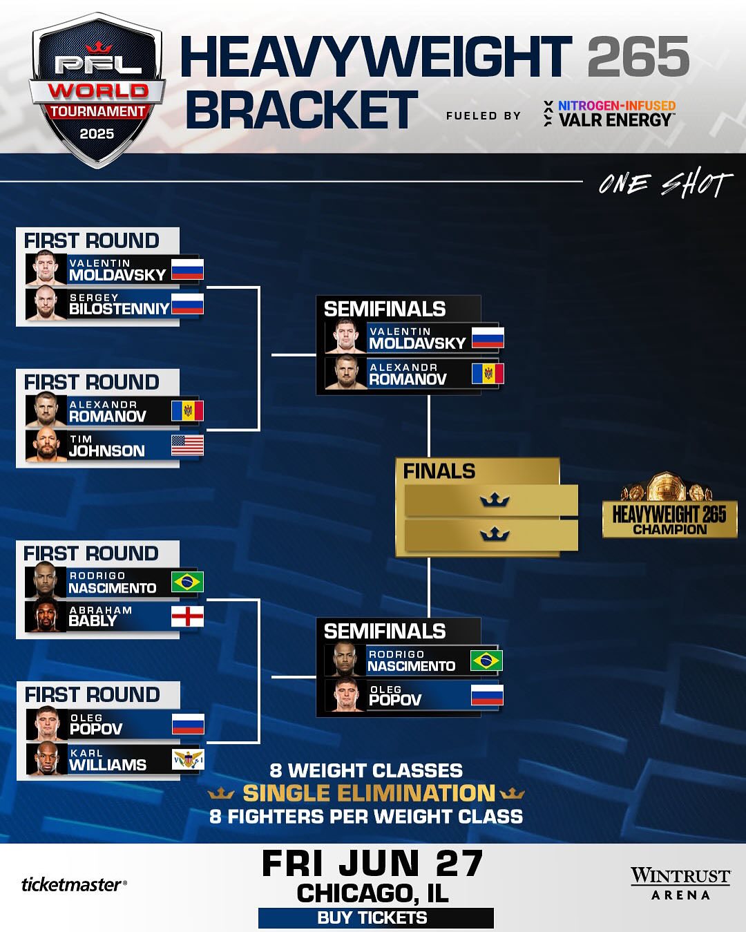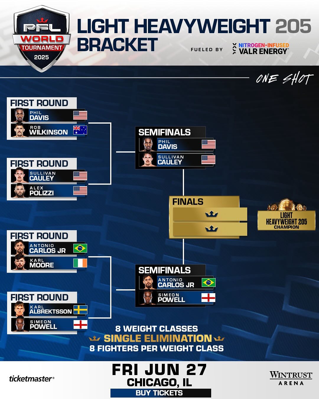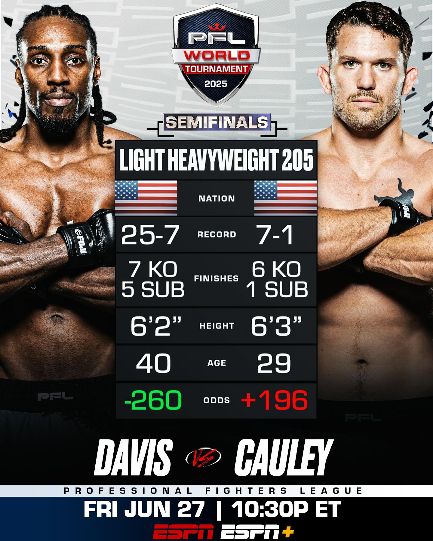A Middleweight Semifinal between Fabian Edwards (14-4) and Josh Silveira (14-4) will headline the event, with Light Heavyweights Phil Davis (25-7) and Sullivan Cauley (7-1) clashing in the co-main. The first Middleweight Semifinal features a rematch between Aaron Jeffery (16-5) and Dalton Rosta (10-1), while Antonio Carlos Jr. (17-6) faces England’s Simeon Powell (11-1) in the second 205-pound Semifinal. Rounding out the 2025 PFL World Tournament Semifinal action on June 27 are the Heavyweights, as Valentin Moldavsky (14-4) meets Alexander Romanov (19-3), and Oleg Popov (20-2) squares off against Rodrigo Nascimento (12-3).