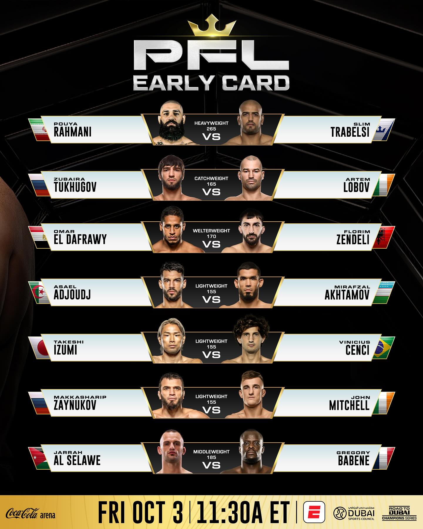 The action begins with seven Early Card bouts, highlighted by a Heavyweight showdown between former Iranian National Team wrestler Pouya Rahmani (4-0) and former Tunisian Olympic wrestler Slim Trabelsi (8-0), along with a long-awaited grudge match nearly seven years in the making as Zubaira Tukhugov (20-6-1) finally meets Artem Lobov (14-15-1) in Dubai.文章源自武享吧-https://hula8.net/pfl/75958.html