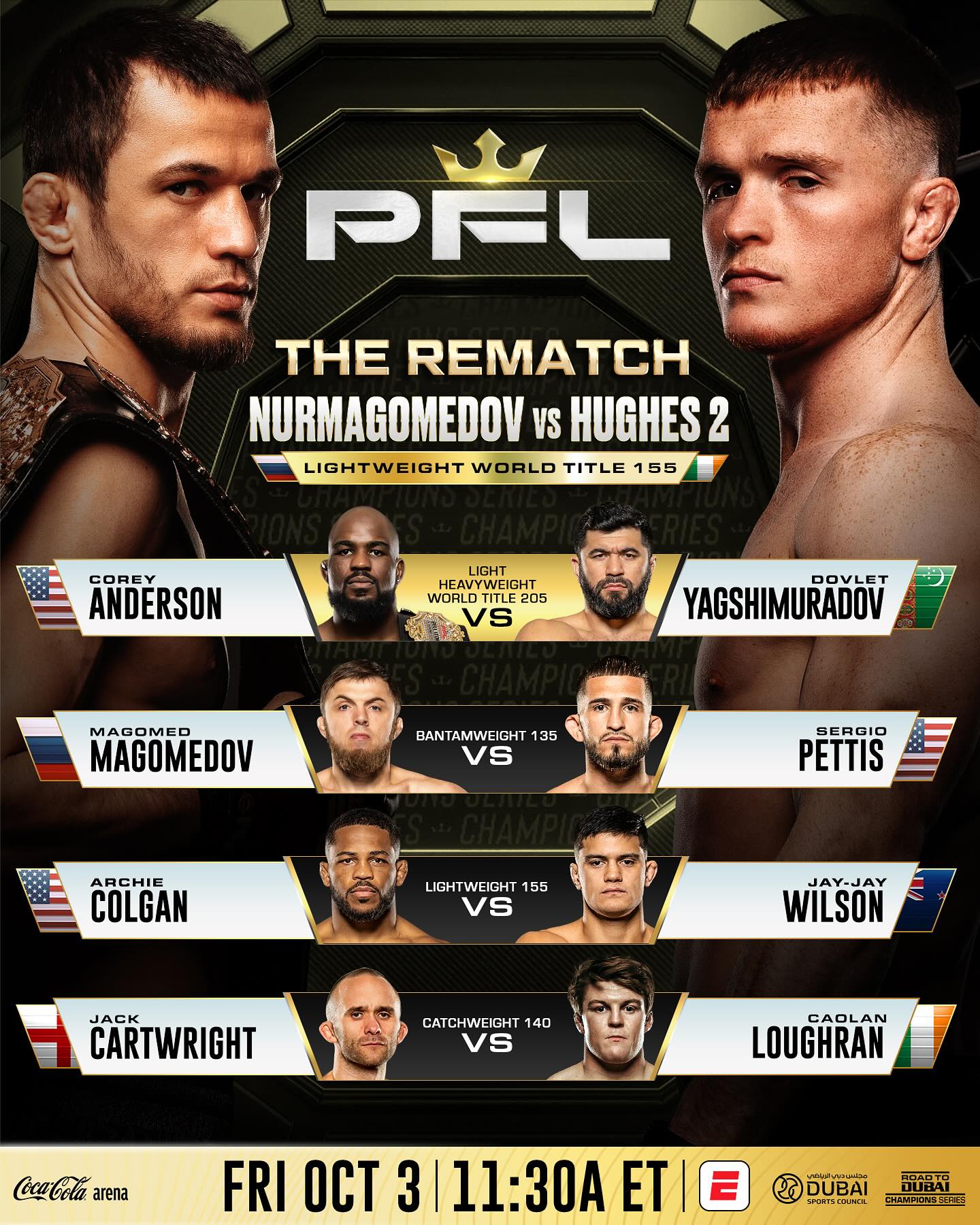 The Main Card features five high-stakes bouts streaming on ESPN Unlimited, headlined by a Lightweight World Title showdown as undefeated champion Usman Nurmagomedov (19-0, 1 NC) takes on Ireland’s Paul Hughes (14-2). In the co-main event, former Bellator Light Heavyweight Champion Corey Anderson (19-6) battles 2024 PFL Light Heavyweight Champion Dovlet Yagshimuradov (25-7-1) for the World Title.
