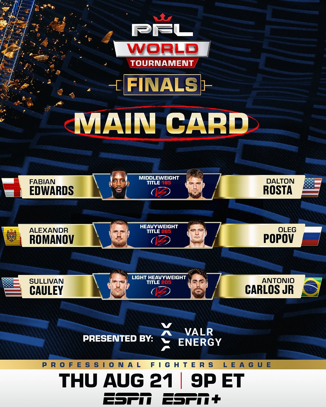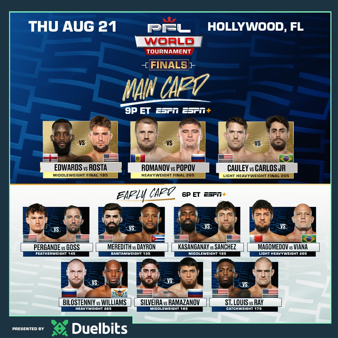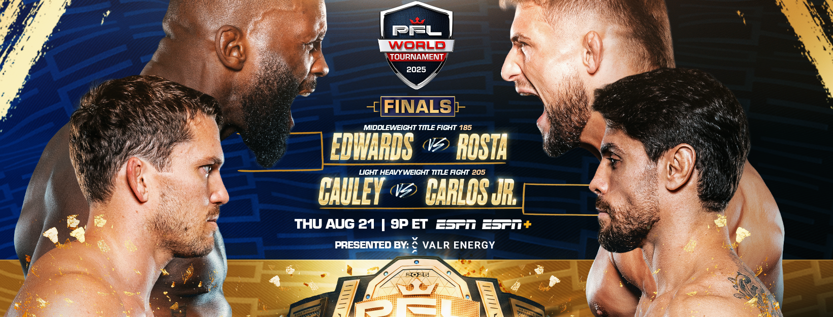 Middleweights headline the card as England's Fabian Edwards (15-4) looks to secure his first PFL title against South Florida's own Dalton "Hercules" Rosta (11-1) in what is sure to be fireworks. In the co-main event, a duo of grapplers take the stage as rising star Sullivan Cauley (8-1) will look across the SmartCage at 2021 PFL Light Heavyweight Champion Antonio Carlos Jr. (18-6). Both finals are scheduled for five, five-minute rounds, with the winners crowned as PFL Tournament Champions and earning their share of over $20 million in prize money.