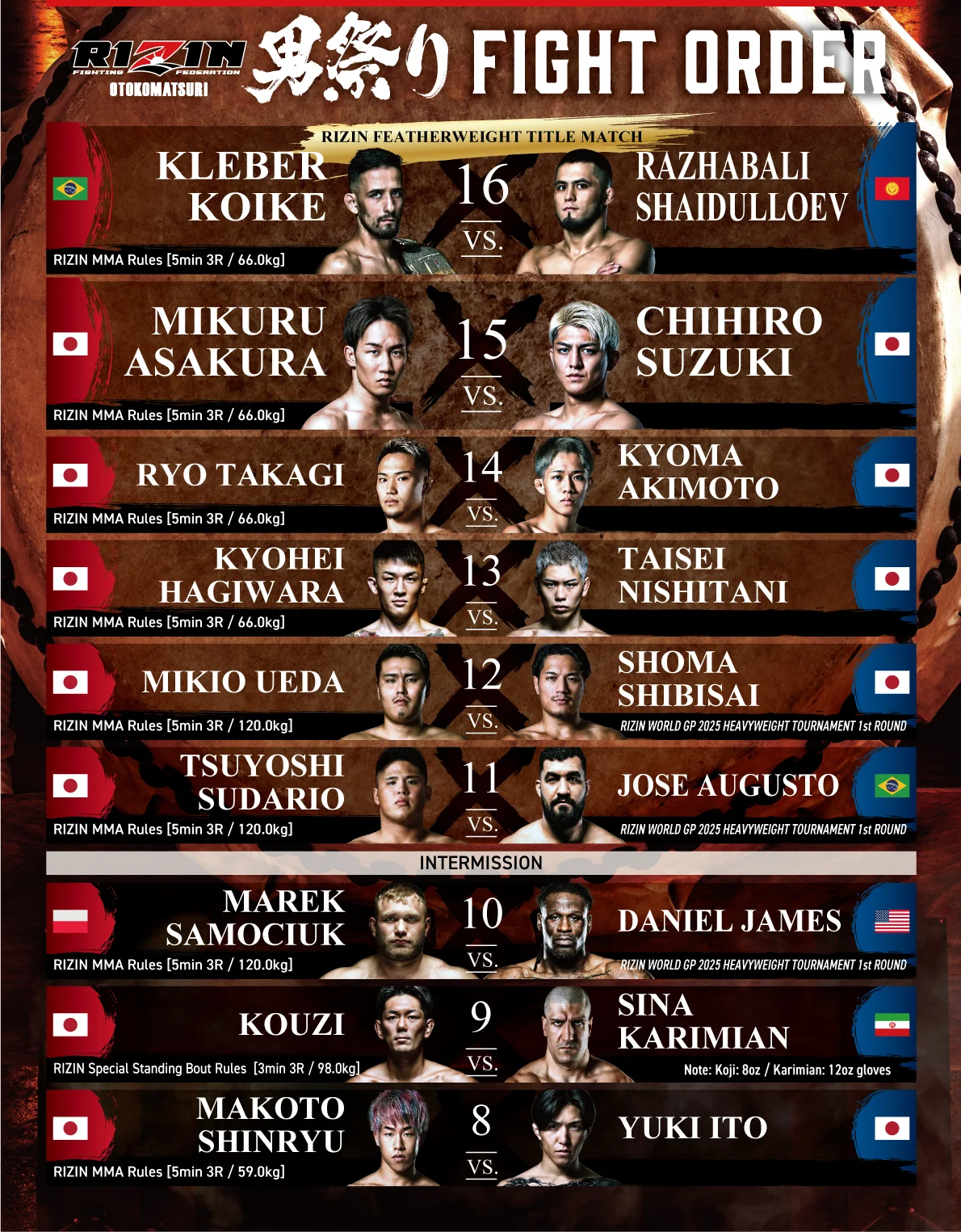 A featherweight rematch between Mikuru Asakura and Ren Hiramoto was scheduled to headline the event. The pairing previously met at Super Rizin 3 in July 2024, which Hiramoto won by first-round knockout. However on March 3, the promotion officially announced that Hiramoto withdrew due to a shoulder injury and Asakura expected to still compete on the card. On March 7, the promotion announced that the event is changed to Rizin: Otoko Matsuri.
