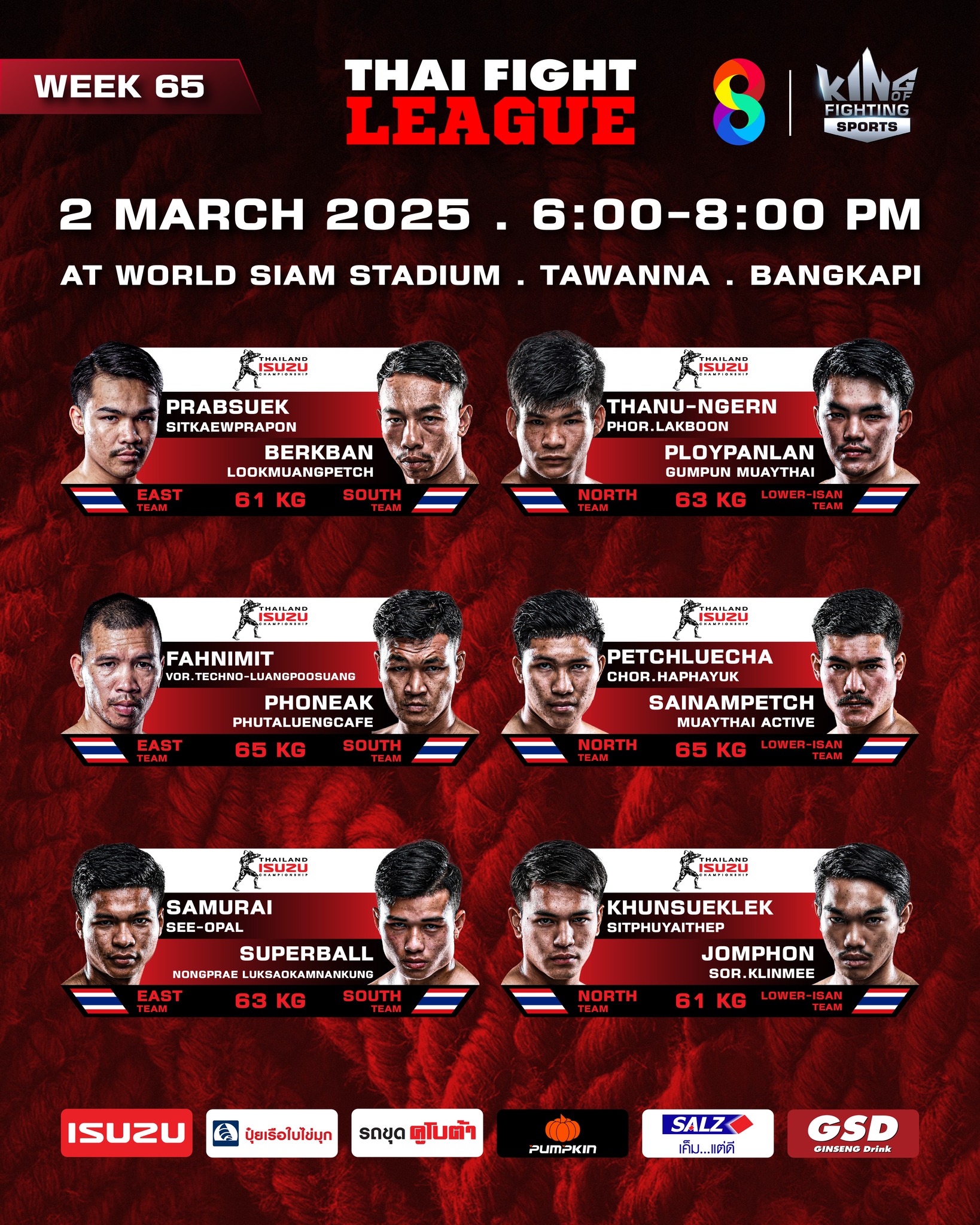 2025年3月2日“五十铃泰国”之争冠军赛”绳拳新传奇通过寻找 18 名新一代拳击手,泰国搏击新一代(THAI FIGHT NEW GEN),成为下一代伟大的泰拳拳手。下面为本期比赛视频。