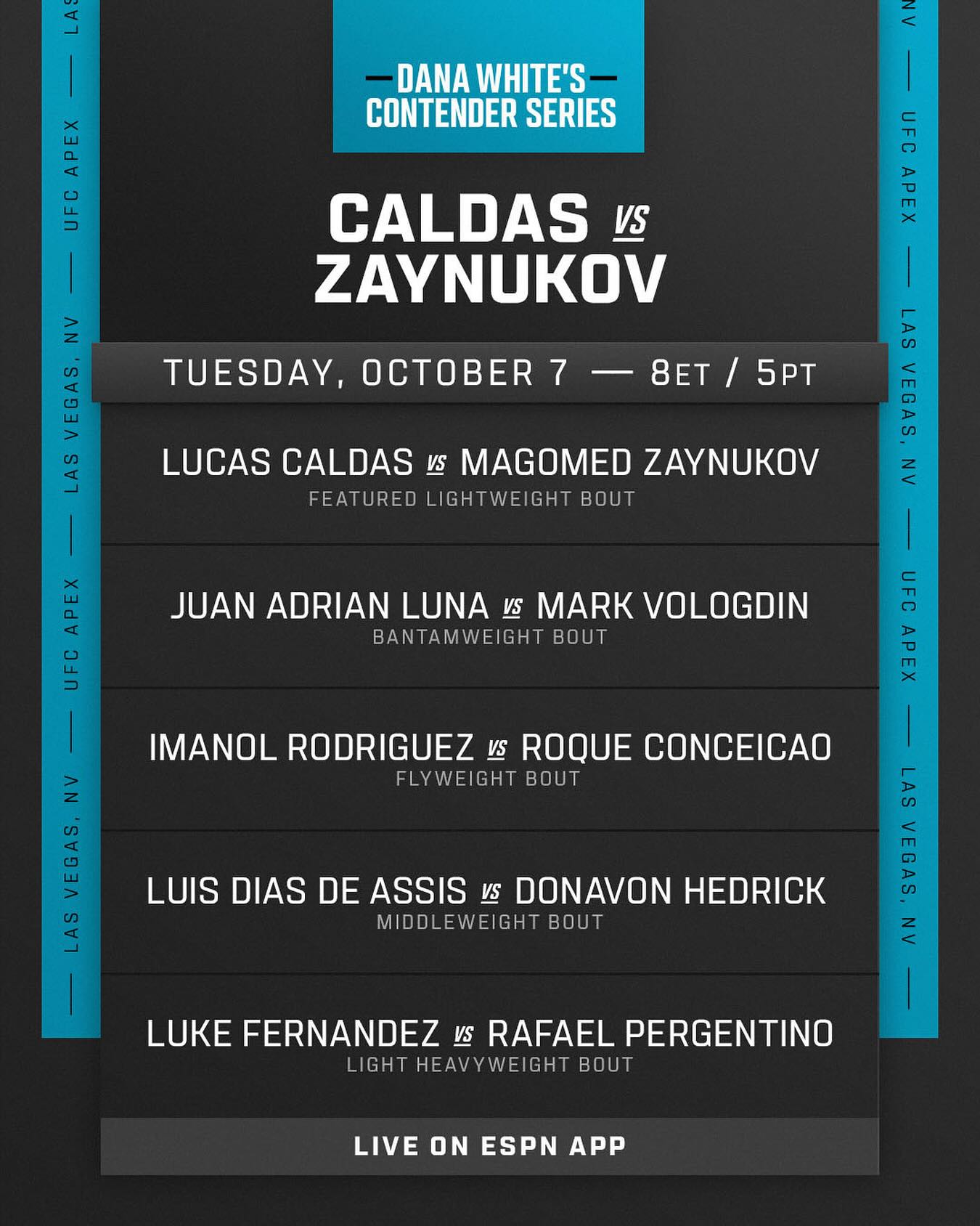Dana White's Contender Series 2025: Season 9 - Week 9 - Caldas vs. Zaynukov is a mixed martial arts event to take place on October 7, 2025 at the UFC Apex in Las Vegas, Nevada, United States.文章源自武享吧-https://hula8.net/ufc/76187.html